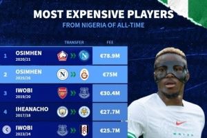体育资讯7月31日讯 奥斯梅恩转会加拉塔萨雷只待官宣,《转会市场》也统计了尼日利亚球员历史转会费榜单,奥斯梅恩独占前二。